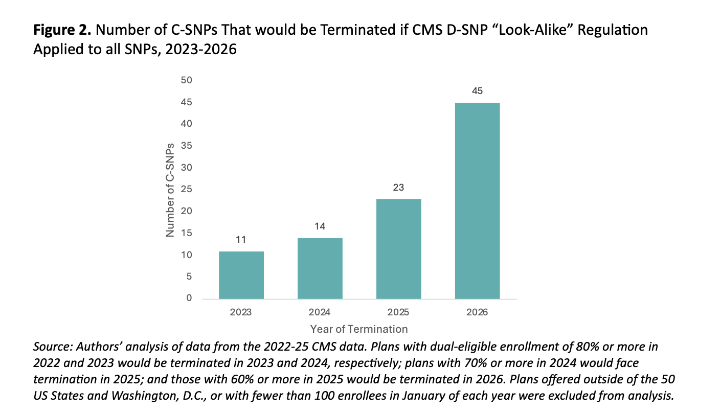 In recent work, we found that there was a growing number of C-SNPs that were enrolling high proportion of dual-eligible beneficiaries that would have been terminated if CMS applied the look-alike termination policy to C-SNPs (Figure 2).5 Our findings are largely consistent with the results presented in the proposed rule.