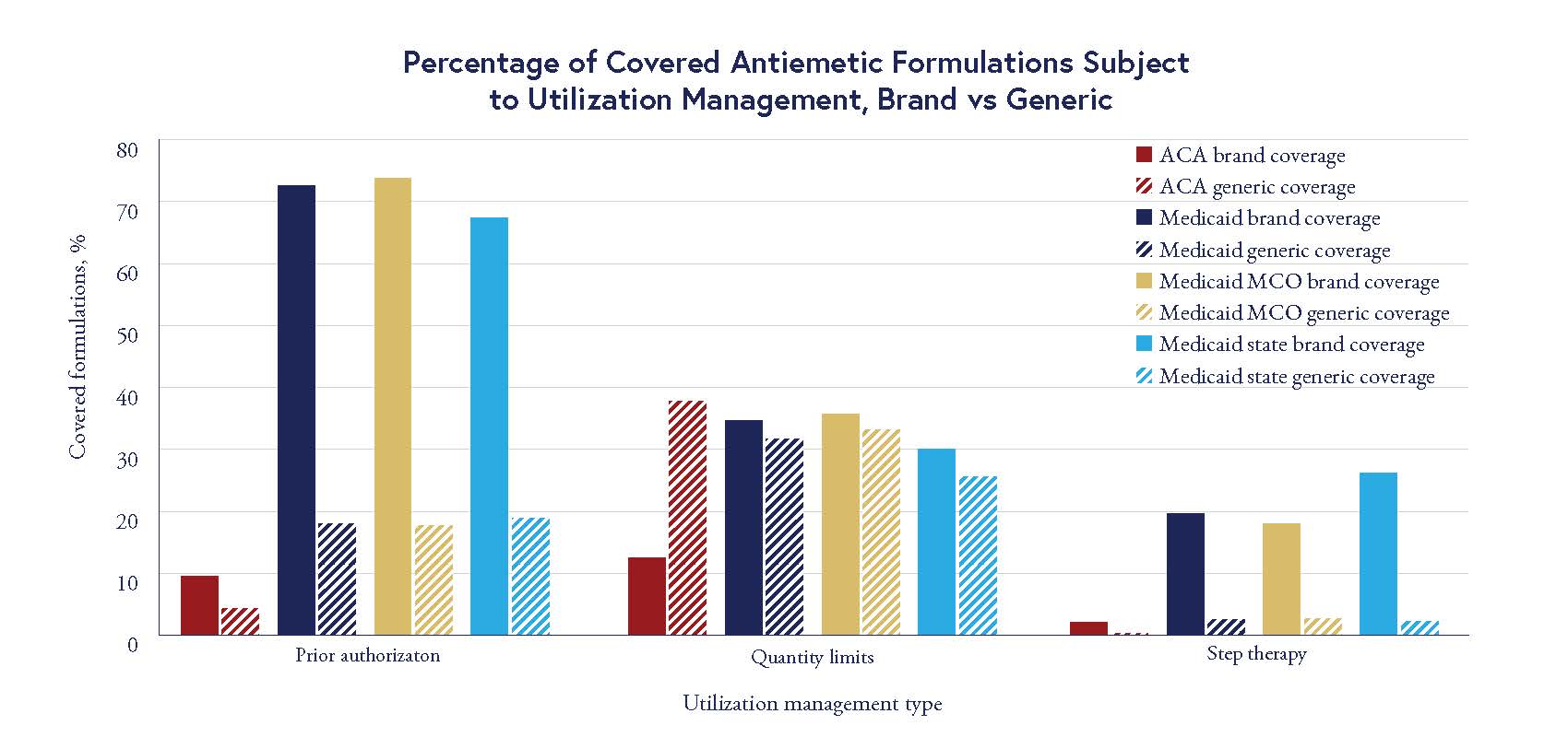 The chart above highlights differences in UM requirements by drug and coverage type. Across all coverage types, brand antiemetics were subject to UM by prior authorization more often than generics (ACA: 9.5% brand, 4.3% generic; Medicaid: 72.7% brand, 17.9% generic). While this variation was expected, the team was surprised to find UM restrictions even on cheaper generic formulations.