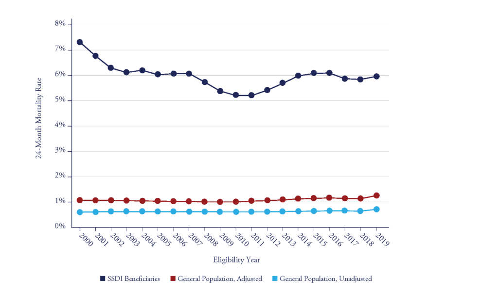 Powell and colleagues used the Social Security Disability Analysis File (DAF) to identify new beneficiaries from 2000 to 2019 who were ages 18-62 years old when they first became entitled to SSDI benefits. The researchers calculated mortality rates by year, age group, and primary impairment, which consisted of three broad categories: primarily functional impairments, systemic diseases, and mental disorders. They compared the SSDI population mortality rates with those of the general population ages 18 to 62 using the 2000 to 2020 data from the National Vital Statistics System (NVSS), adjusting for the age and sex distribution of new SSDI beneficiaries in each year.